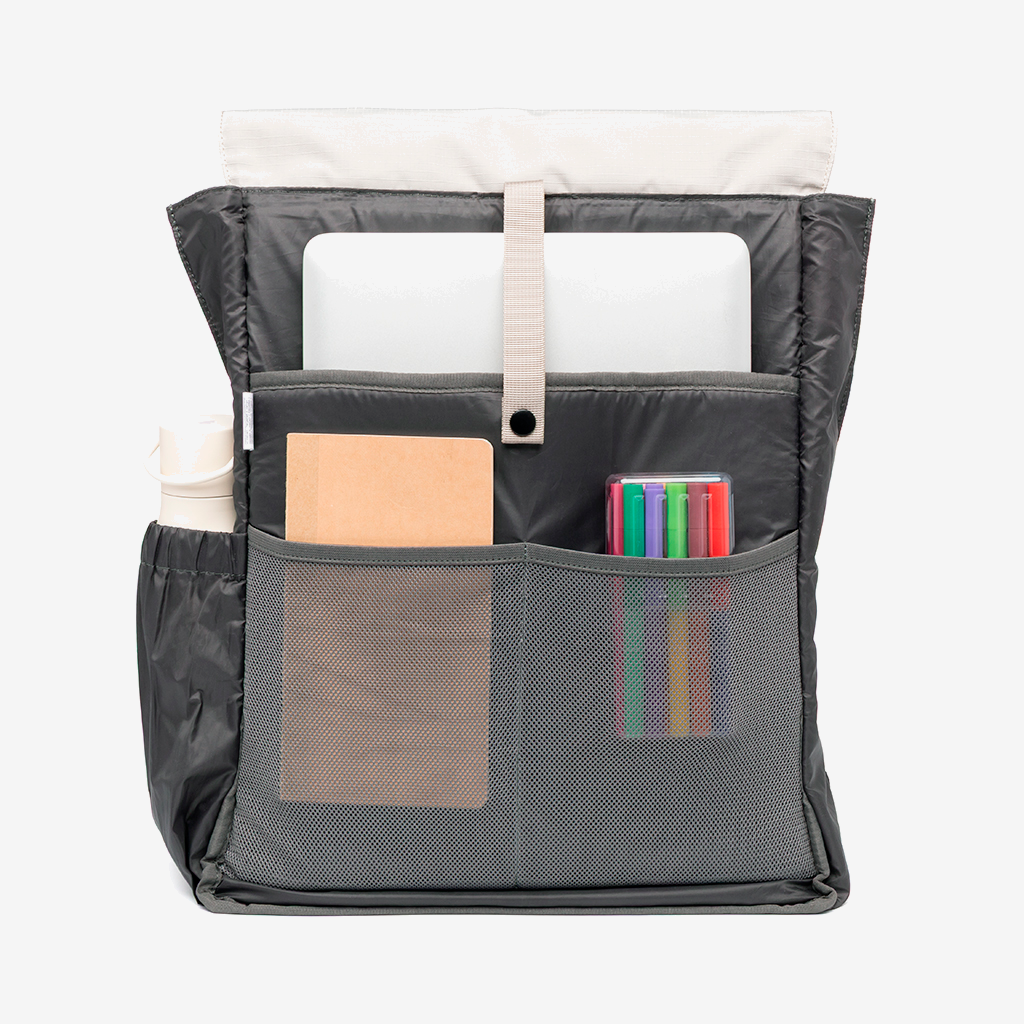 Su tejido RIPSTOP RPET lo hace ultraligero, vegano y resistente al agua y a los arañazos. Lavar con agua fría. Secar al aire. Ver nuestra guía de cuidados Para más información.