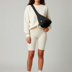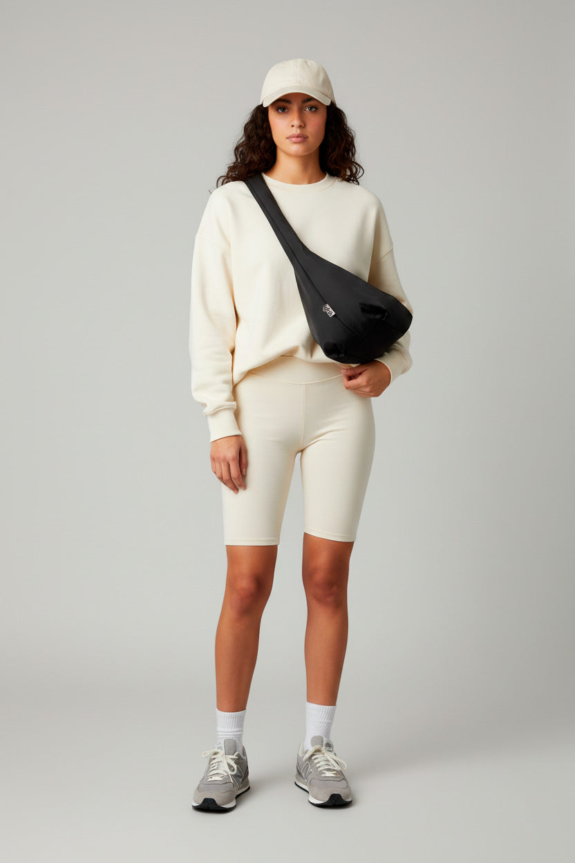 Bolso bandolera suave con asa circular sin costuras y diseño redondeado. Fabricado con un tejido 100% reciclado suave y sutilmente texturizado. Se cierra de forma segura con una cremallera en la parte superior, garantizando que tus pertenencias permanezcan a salvo. En el interior, encontrarás un práctico bolsillo interior con cremallera para una mayor organización.