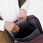 Our classic document holder silhouette in a backpack with two separate compartments for extra organisation. The front compartment features multiple pockets and mesh organisers for small items. The second and larger compartment has a padded pocket for laptops and other electronic devices up to 15.6"*.
